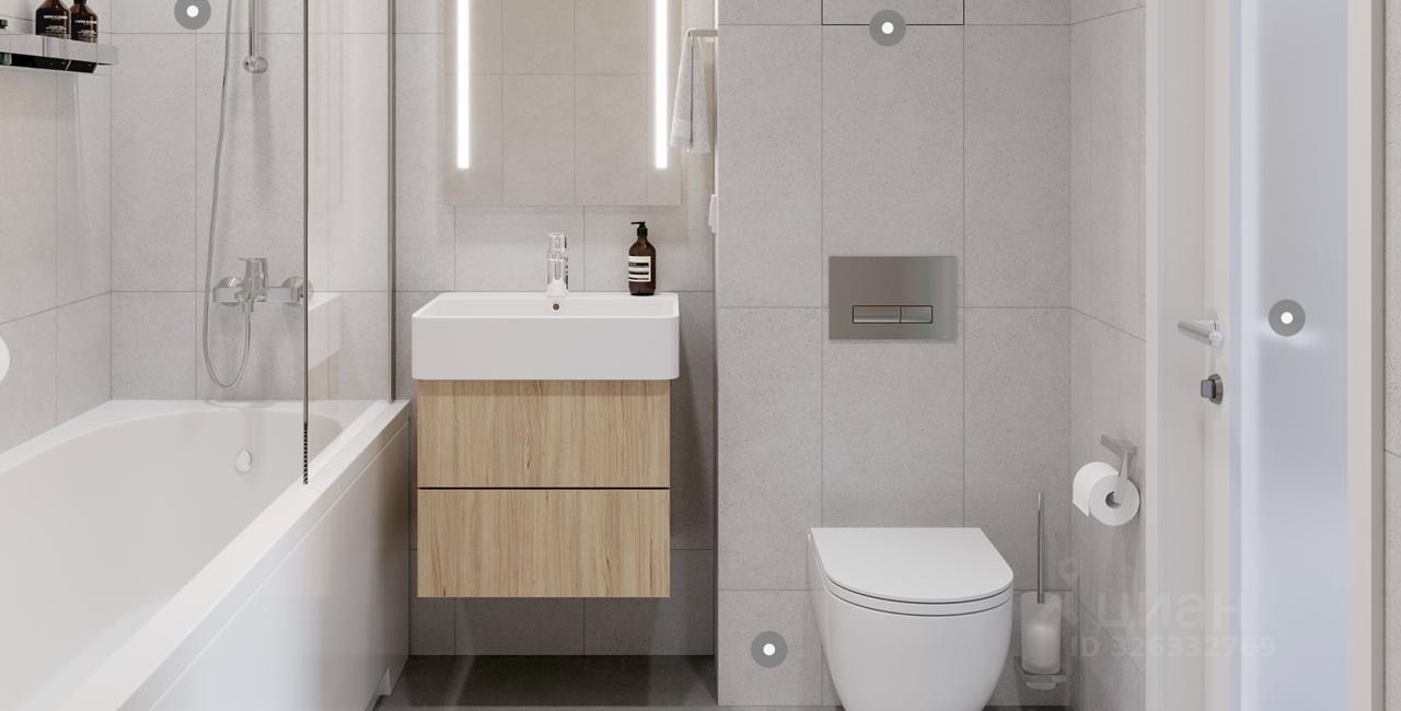 Отделка. На полу уложен серый керамогранит, а на стенах — серая плитка. Ревизионный люк скрыт и отделан под плитку. Завершает интерьер матовый натяжной потолок со встроенными светильниками.