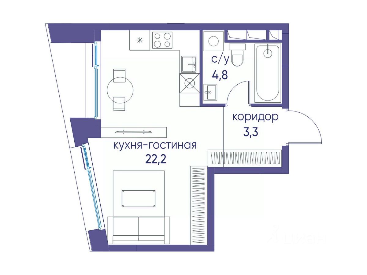 , 1 совмещенный санузел. В жилой зоне 2 больших окна на одну сторону, хорошая инсоляция.