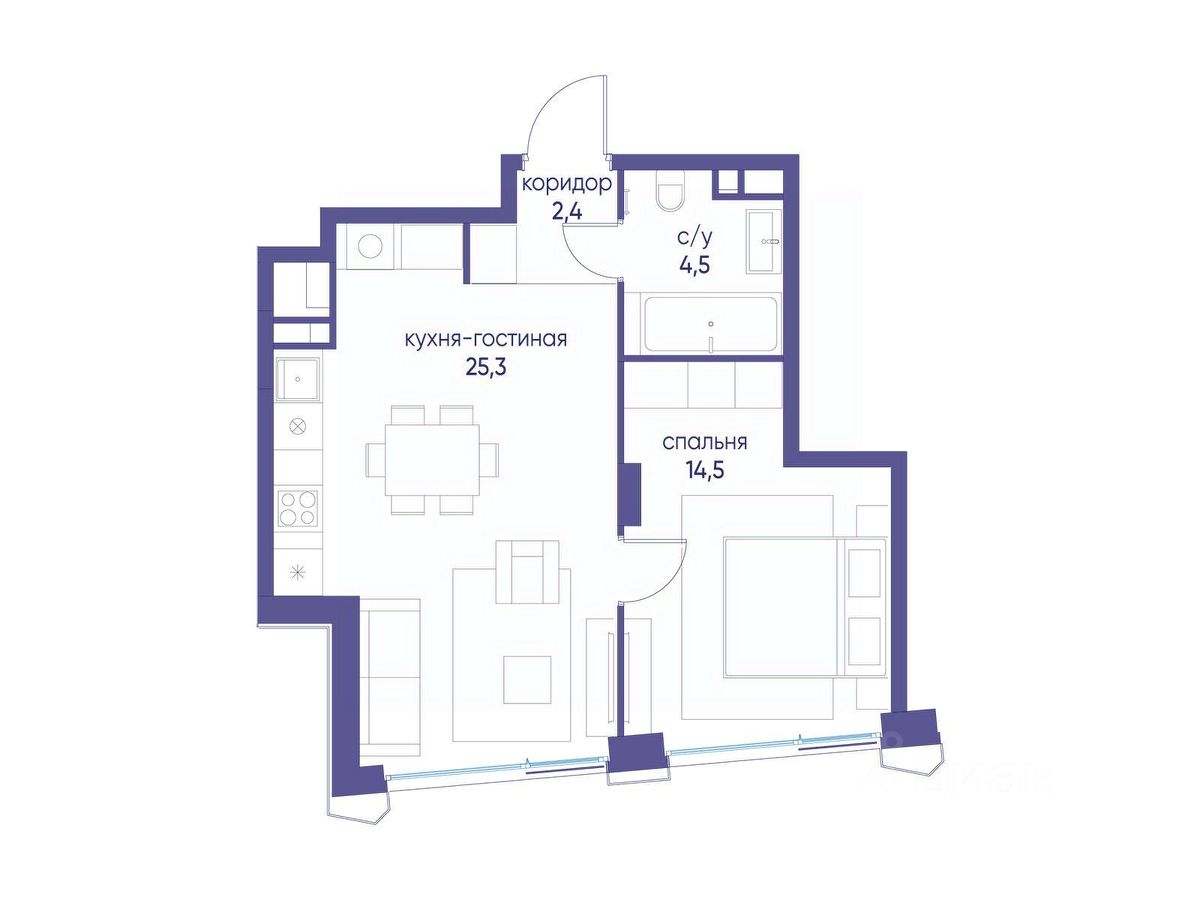 1 совмещенный санузел. В жилой зоне 2 больших окна на одну сторону, хорошая инсоляция.