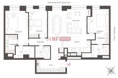 Планировка: гостиная с зоной кухни, две спальни с собственными ванными и кабинет (гостевая спальня), гостевой санузел.