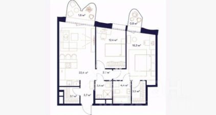 Два балкона: 1.6 кв.м. и 0.8 кв.м.