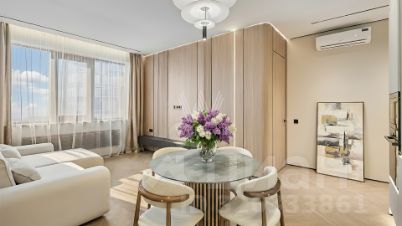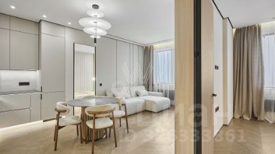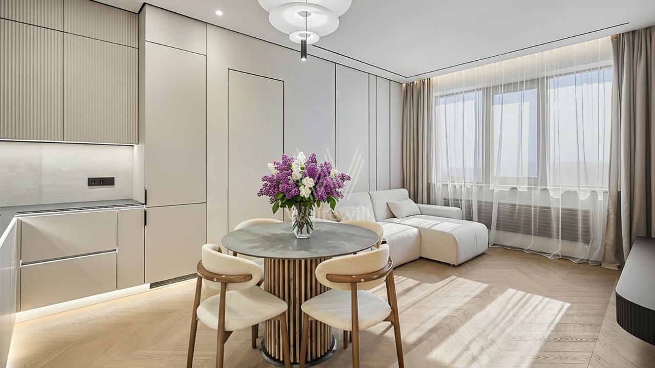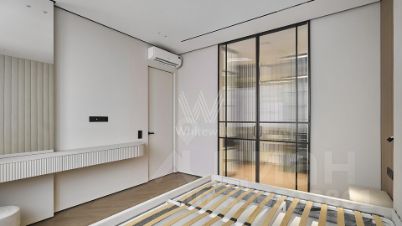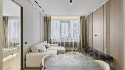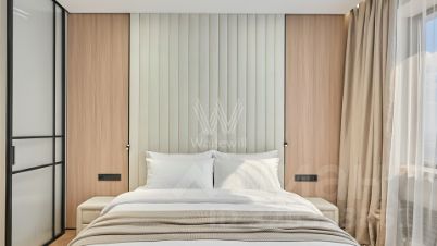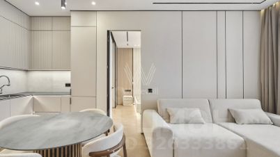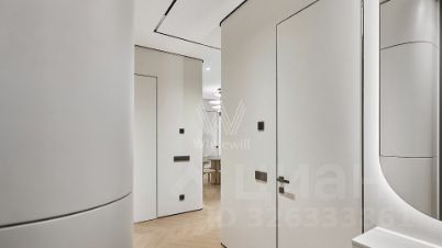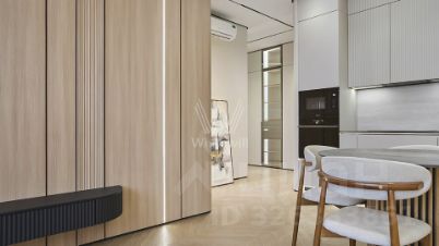 Квартира с 2 спальнями общей площадью 82 м² в комплексе Headliner, рядом с набережной Москвы-реки и деловым центром "Москва-Сити". Квартира с дизайнерской отделкой расположена на 37 этаже в корпусе 6.1. Ремонт выполнен в современном стиле в светлых тонах. В оформлении использованы премиальные материалы — на полу выложен кварц-винил в форме "французской елки", стены покрыты итальянской краской, колеры Little Green.