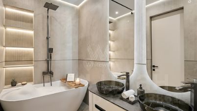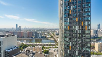 Гостевой и хозяйский санузлы отделаны широкоформатным керамогранитом 120х60. Ванна из литьевого мрамора. Водонагреватель, система от протечек NEPTUN. Кровать в мастер-спальне — 180х200см с подъёмным механизмом, шкафы и стекло в эмали. Планировка включает кухню-гостиную, мастер-спальню со своей ванной комнатой и гардеробной, вторую спальню или кабинет, гостевой санузел, постирочную и прихожую. Из окон открываются панорамные виды на город и Москву-реку.