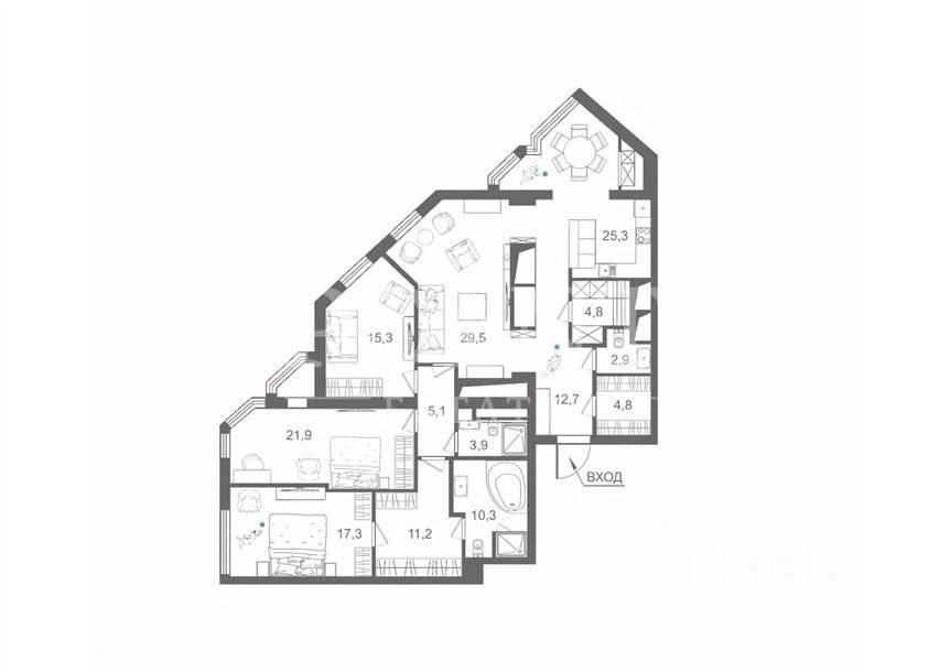 Планировка: гостиная, кухня-столовая, две спальни, одна из которых со своим санузлом и гардеробной, кабинет, гардеробная, совмещенный санузел, гостевой санузел, постирочная, прихожая.