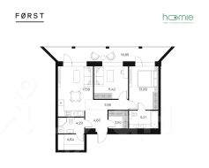 Общая площадь: 66,4м2, жилая: 24,51м2, площадь просторной кухни-столовой: 17,58м2.