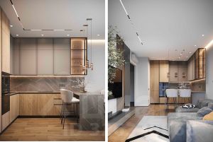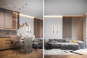 • Общий стиль: тёплое дерево + спокойные серые оттенки, без лишнего визуального шума