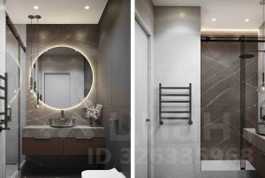 • Санузел как в отеле: крупный формат под камень, стеклянная душевая, зеркало с подсветкой