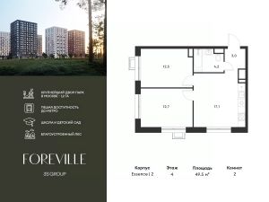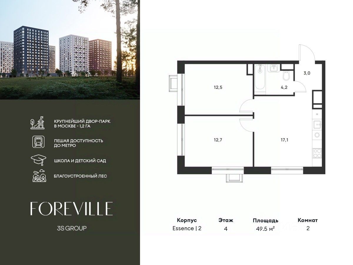 Предчистовая отделка в подарок! Пешая доступность от метро и московская прописка! Продается уютная 2-комн. квартира площадью 49,5 кв.м на 4 этаже 17 этажного жилого комплекса бизнес-класса Foreville от 3S Group.