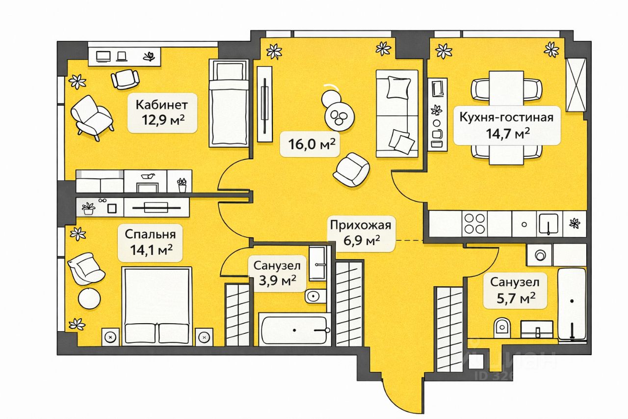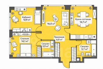Квартира ДЕЙСТВИТЕЛЬНО КОМФОРТНОЙ планировки - ТРИ БОЛЬШИЕ КОМНАТЫ правильной формы, площадью 12.9, 14.1 и 16.0. Кухня площадью 14.7 метров. Два санузла площадью 3.9 и 5.7 метров и большая прихожая площадью 6.9 метров.
