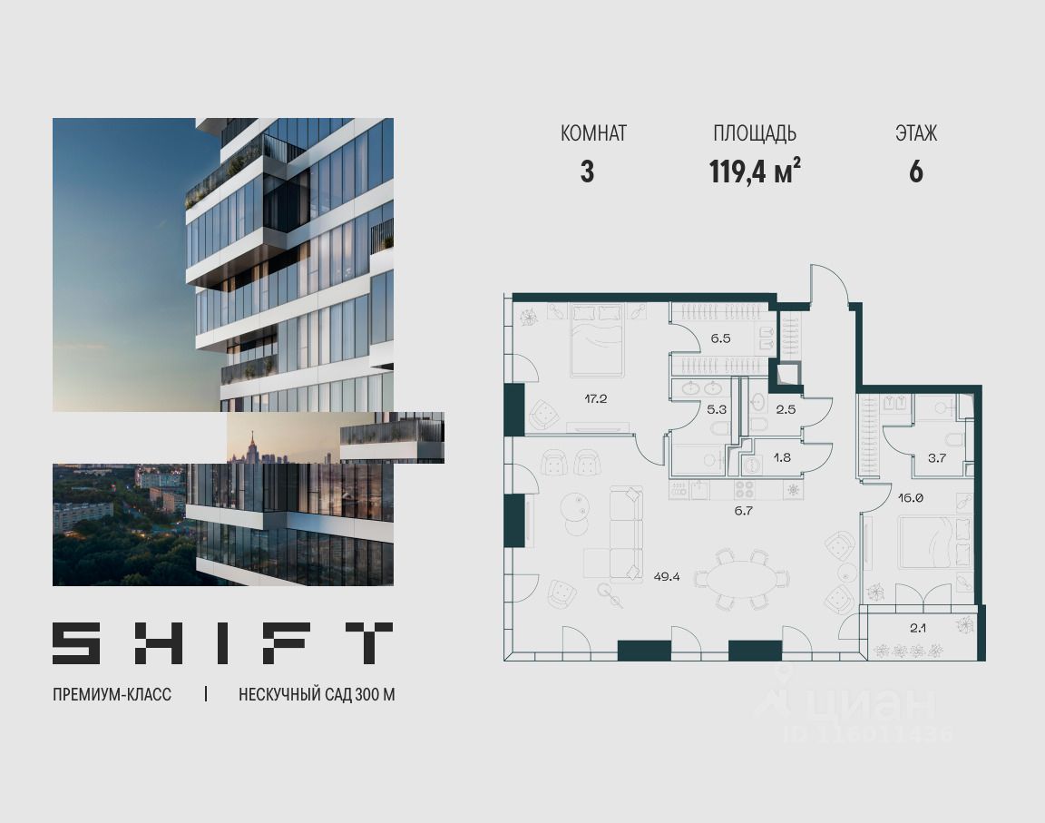 3-к квартира в премиальном комплексе SHIFT на 6-м этаже в 18 этажном здании. Общая площадь 119.4 кв. м.