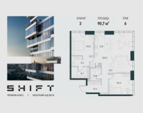 3-к квартира в премиальном комплексе SHIFT на 6-м этаже в 18 этажном здании. Общая площадь 90.7 кв. м.