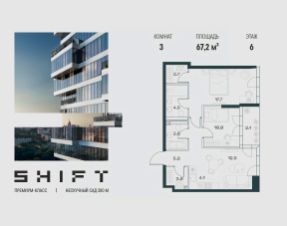 3-к квартира в премиальном комплексе SHIFT на 6-м этаже в 18 этажном здании. Общая площадь 67.2 кв. м.