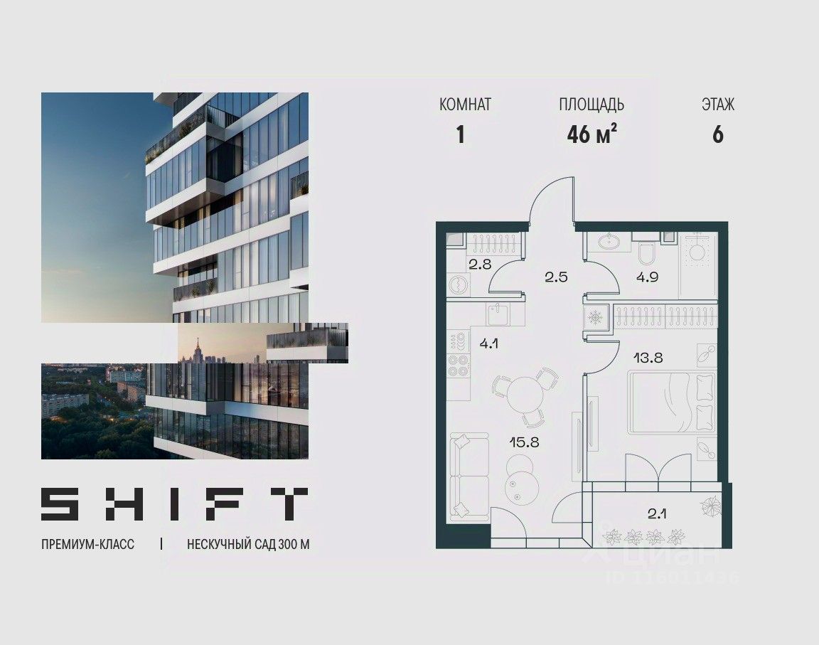 1-к квартира в премиальном комплексе SHIFT на 6-м этаже в 18 этажном здании. Общая площадь 46 кв. м.