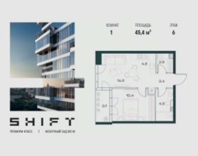 1-к квартира в премиальном комплексе SHIFT на 6-м этаже в 18 этажном здании. Общая площадь 45.4 кв. м.