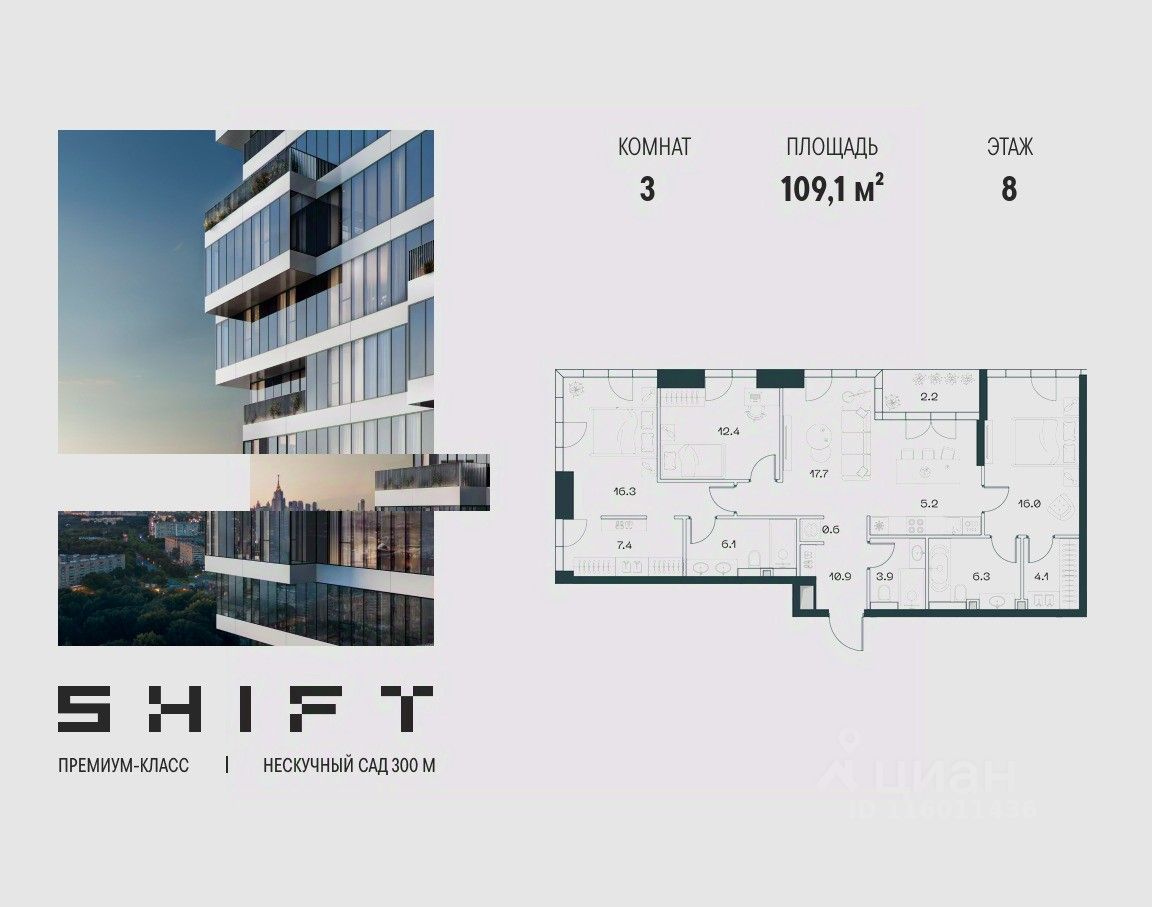 3-к квартира в премиальном комплексе SHIFT на 8-м этаже в 18 этажном здании. Общая площадь 109.1 кв. м.