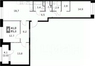 Квартира общей площадью 85,3 м2. Мастер-зона с санузлом и гардеробной. Кухня-гостиная 18,7 кв.м. Есть зона для гардеробной и постирочной. Есть лоджия 4,1 кв.м.