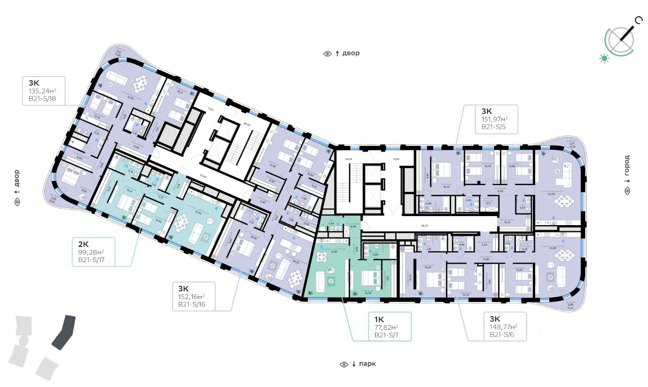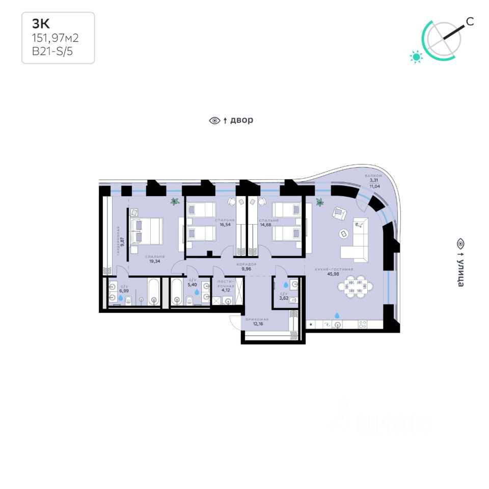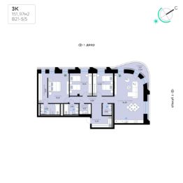 В продаже — трехкомнатная квартира с чистовой отделкой, общей площадью 151,97 кв. м. Квартира расположена на третьем этаже шестиэтажной секции корпуса класса Суперб в новом районе СберСити, который строит Сбер. Дом находится на первой береговой линии Москвы-реки.