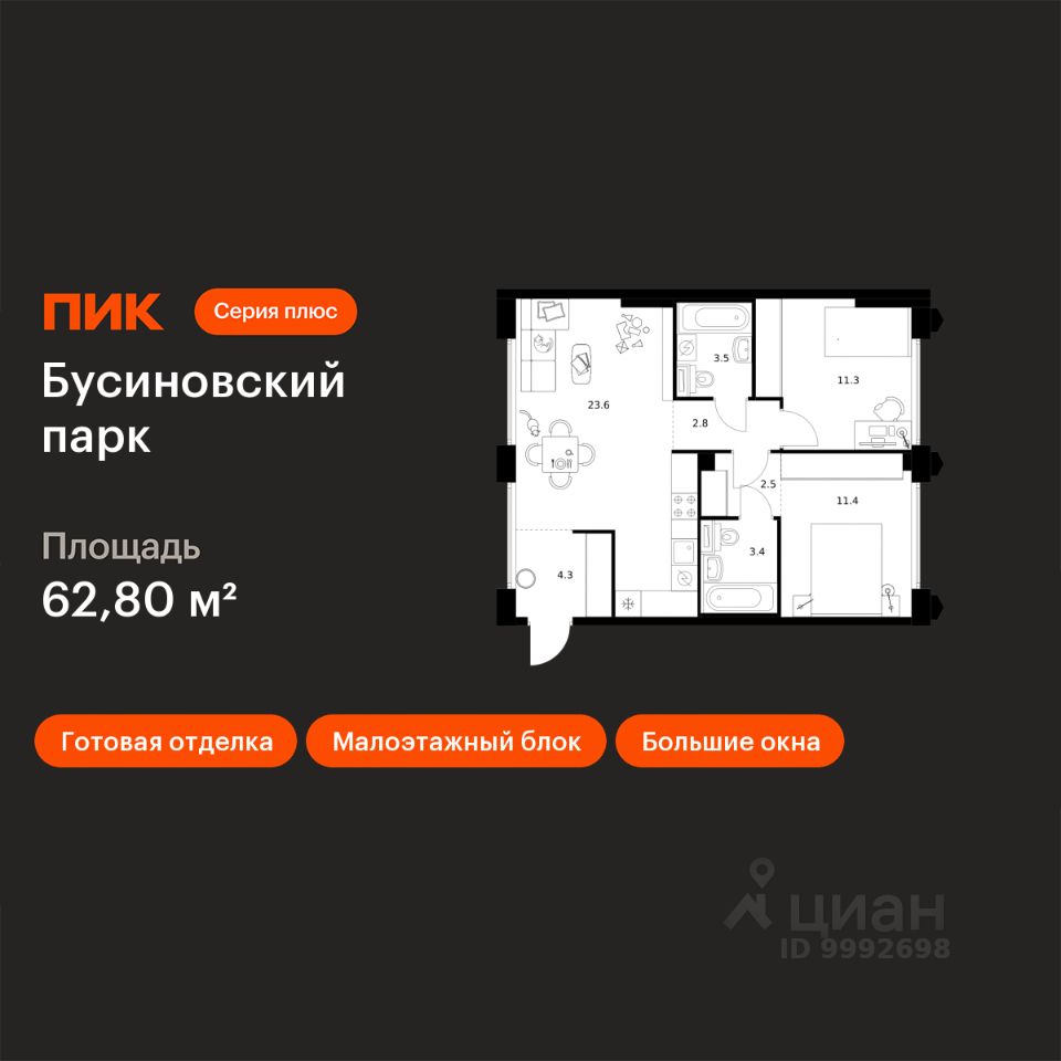 В "Бусиновском парке" предусмотрены квартиры с панорамным остеклением, различными балконами, эркерами, угловыми окнами и большим количеством окон — до пяти в одной комнате. В таких квартирах широкий угол обзора: можно пить кофе, наблюдая за жизнью на улице и наслаждаясь ощущением простора. Ещё больше комфорта придаст мягкий солнечный свет, который равномерно осветит всю квартиру. Артикул 95
