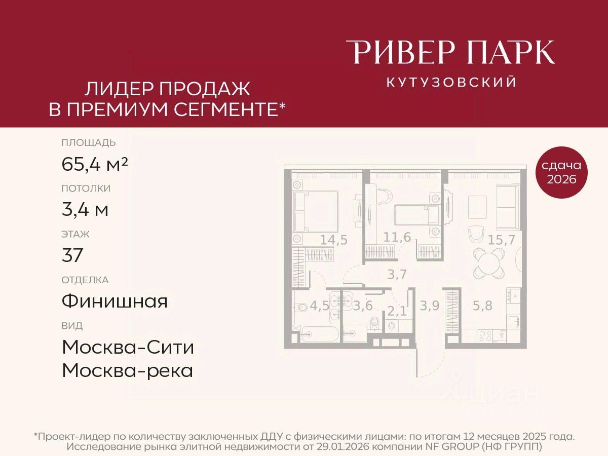 Продается 2-к квартира площадью 65.4 кв.м. на 37-м этаже в жилом комплексе премиум-класса Ривер Парк Кутузовский в Башне Топаз