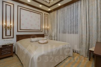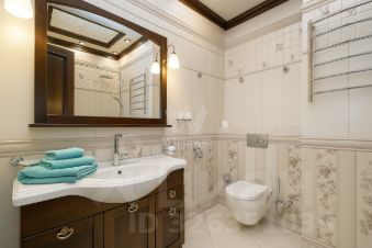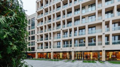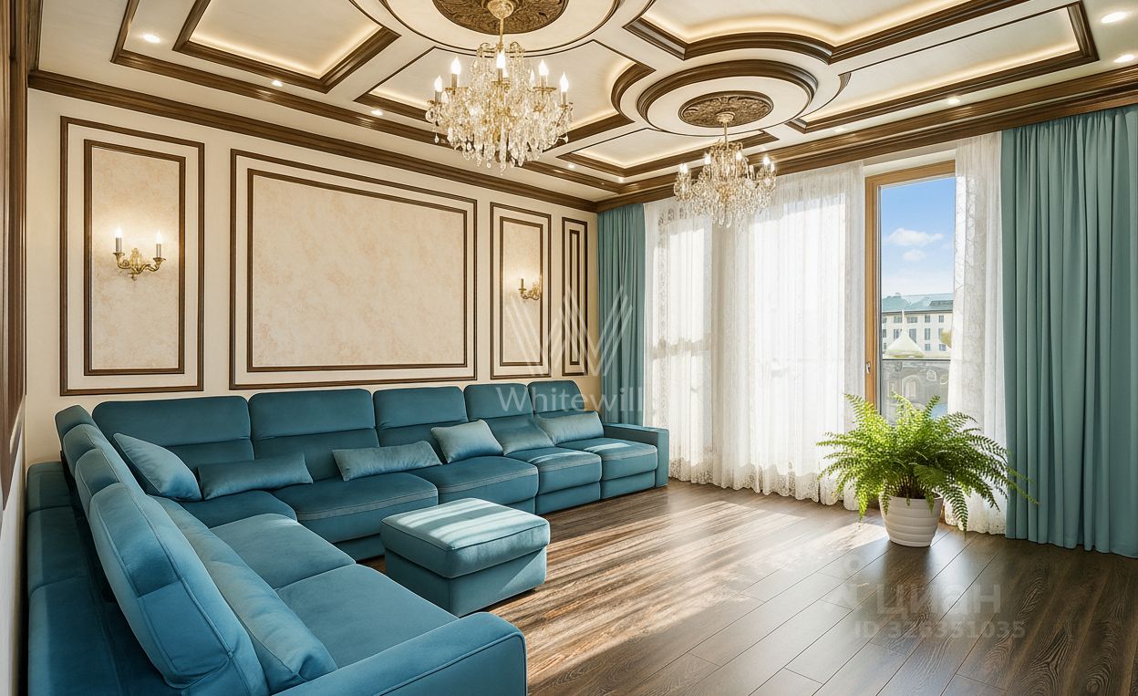 Апартаменты с двумя спальнями общей площадью 92 м² в комплексе Smolensky De Luxe. Выполнен ремонт в классическом стиле. Интерьер выдержан в цветах благородного дерева с мягкими акцентами бирюзы. В отделке использована натуральная древесина и камень. Полы выложены мрамором и тёмным паркетом. Кессонные потолки с резными узорами и золотистыми подвесными люстрами с декором из стекла.