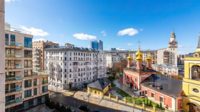 Планировка: кухня-гостиная, две спальни со своими ванными комнатами и встроенными гардеробными шкафами, гостевой санузел, балкон и холл. Установлена мягкая мебель, в гостиной большой угловой диван, обеденный стол на четыре персоны. Кухня оборудована встроенной бытовой техникой. С балкона открывается вид на Никольскую церковь в сторону Садового кольца и Нового Арбата. В стоимость входит машино-место в подземном паркинге.