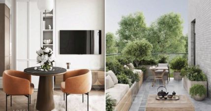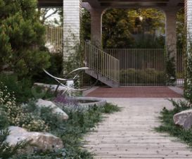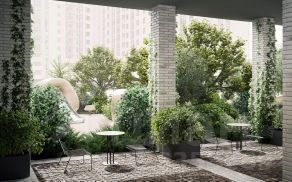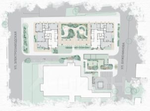 На первом этаже галерея, которая формирует двухуровневое пространство приватного атриумного двора, обустроенного садом с дорожками из натурального камня, зоной для тренировок на открытом воздухе, местами для отдыха и работы. Под галереей размещена парадная гостиная. Первые этажи домов занимают объекты коммерческой инфраструктуры.