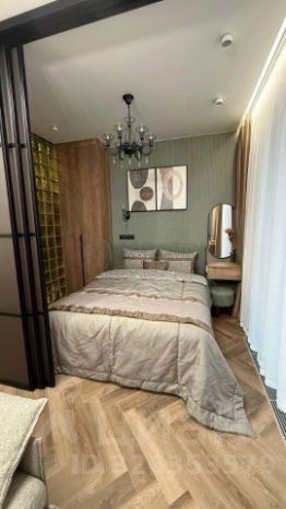 — Спальня отделена раздвижной перегородкой, с электрошторами на все панорамные окна
