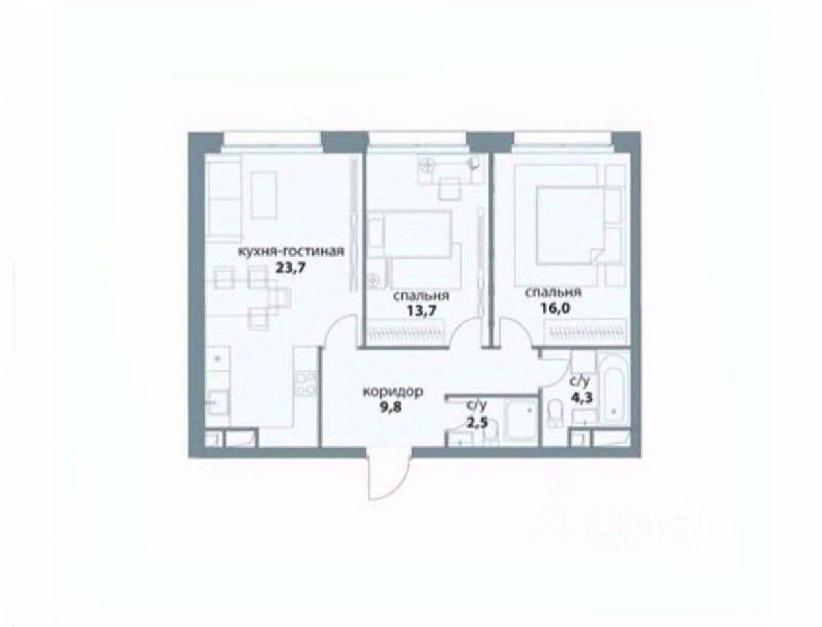 Трехкомнатная квартира на 6 этаже в современном жилом комплексе.