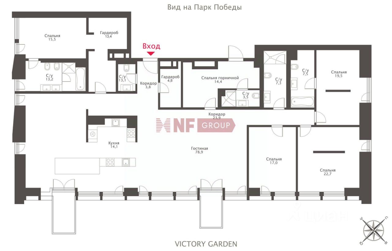 Планировка: гостиная-столовая с зоной кухни, пять изолированных спален, пять санузлов,