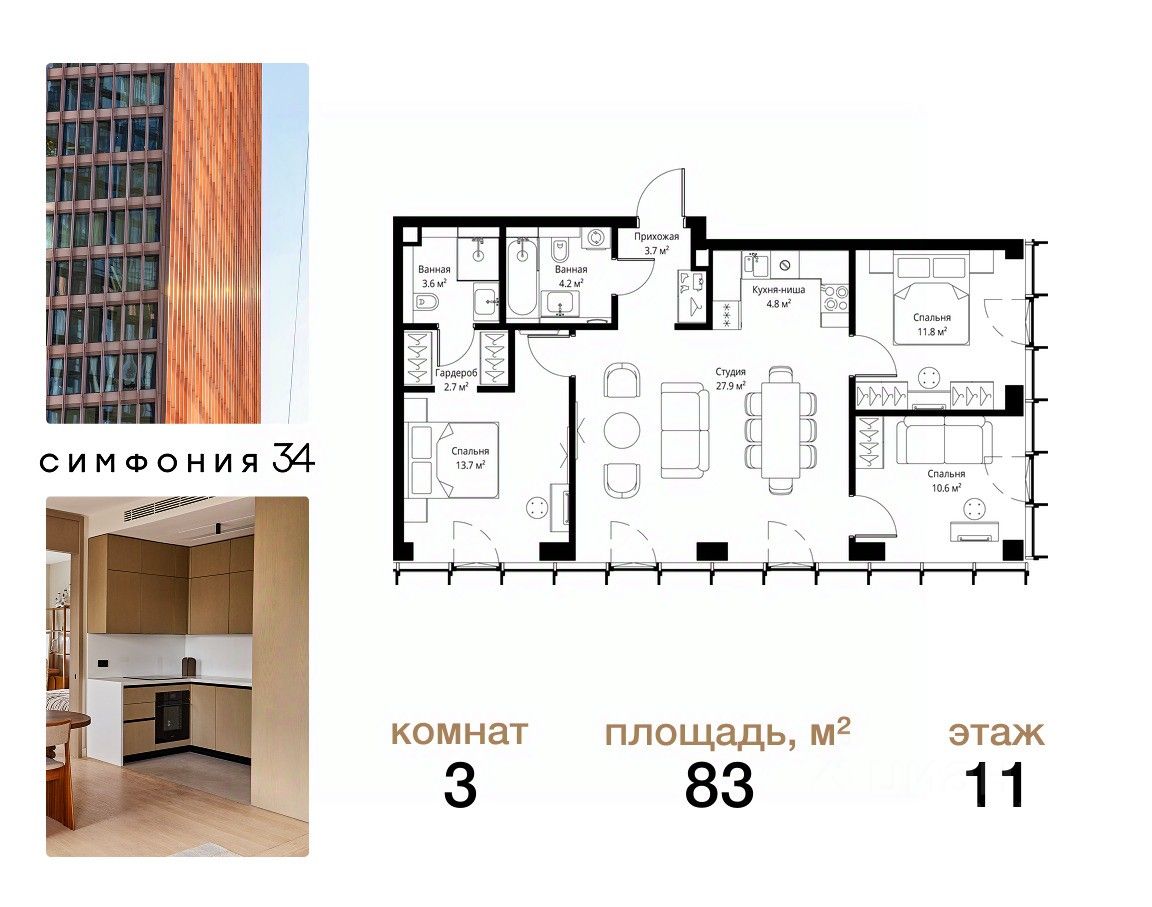 В продаже 3-комнатная квартира площадью 83 м² с чистовой отделкой на 11 этаже 36 этажного дома в корпусе Сиена.