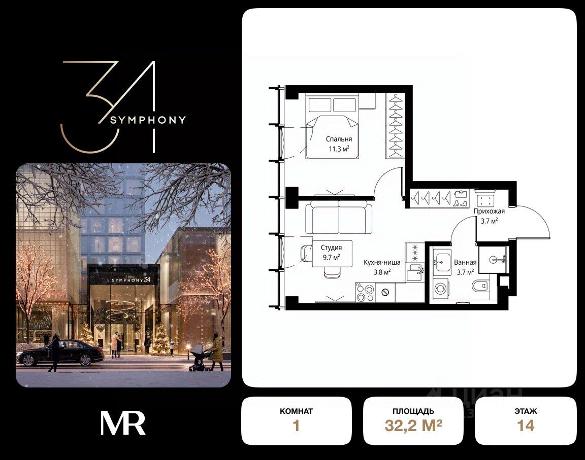 В продаже 1-комнатная квартира площадью 32.20 м² с чистовой отделкой на 14 этаже 36 этажного дома в корпусе Сиена.