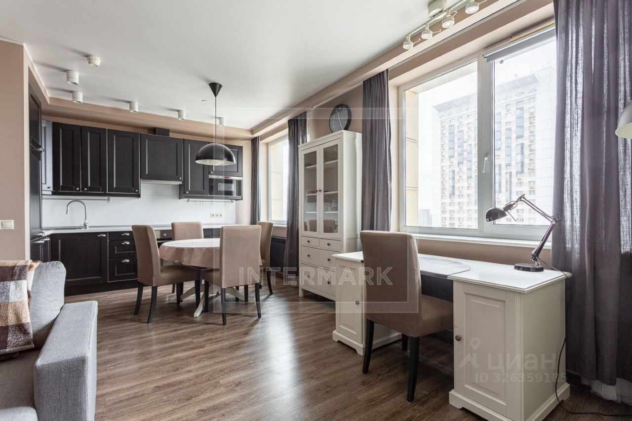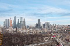 Функциональная линейная планировка: большая студия, просторная спальня, совмещенный с/у. Предусмотрено много шкафов для хранения вещей. Панорамные виды на Москву, деловой центр Москва-Сити с 24-го этажа.