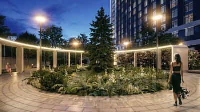 Секции дома "смотрят" на Главный бульвар парка "Событие", который занимает более половины территории квартала и включает спортивные, прогулочными, событийные, молодежные пространства и большую природную зону у реки.