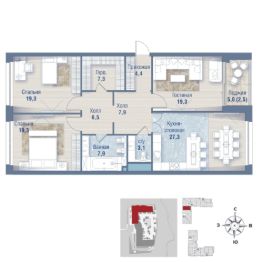 Продается просторная квартира площадью 126.90 м2 в жилом комплексе РЕКА. Квартира находится в 5 секции корпуса 1 введен в эксплуатацию в 4 кв. 2021. Этаж 4-й из 11.