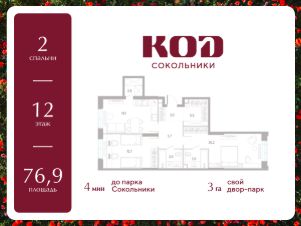 В семейном жилом квартале, расположенном в окружении более 500 га леса и объектов исторического наследия, продается 2-комнатная квартира площадью 76.9 кв. м без отделки. Квартира расположена на 12 этаже 39-этажного корпуса 2.2 жилого квартала бизнес-класса КОД Сокольники от девелопера Новая Эра.