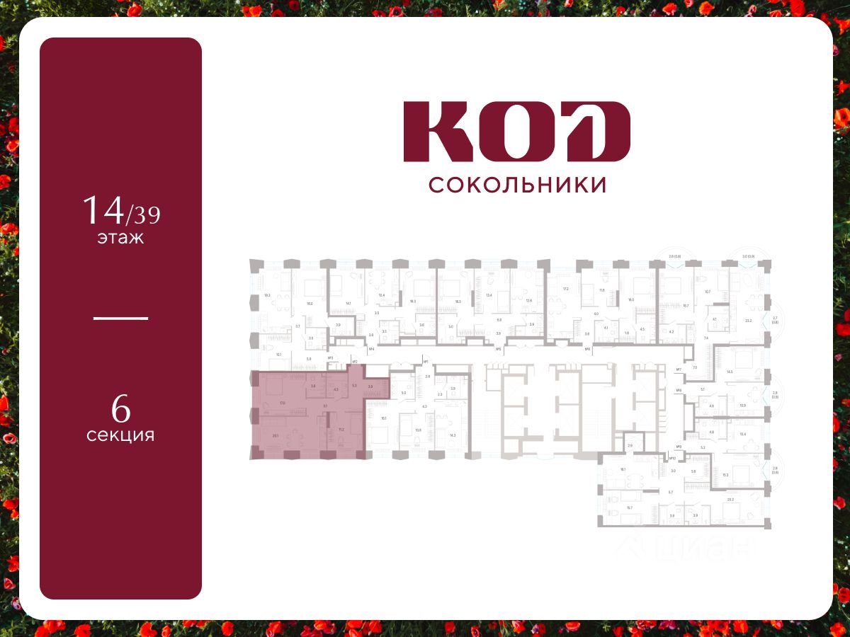 В семейном жилом квартале, расположенном в окружении более 500 га леса и объектов исторического наследия, продается 2-комнатная квартира площадью 70.7 кв. м без отделки. Квартира расположена на 14 этаже 39-этажного корпуса 2.2 жилого квартала бизнес-класса КОД Сокольники от девелопера Новая Эра.