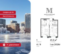 Продаётся 1-к квартира 41,3 кв.м. в ЖК "Михалковский" на 4-м этаже 9 этажного дома.