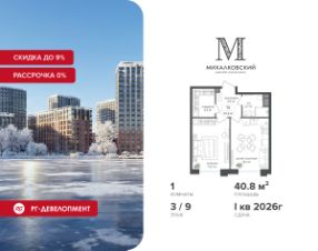Продаётся 1-к квартира 40,8 кв.м. в ЖК "Михалковский" на 3-м этаже 9 этажного дома.