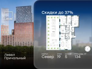 В готовом жилом комплексе на набережной Москвы-реки продается многокомнатная квартира площадью 134 кв.м без отделки. Квартира расположена на 19 этаже 32 этажного корпуса " Север" в жилом комплексе бизнес-класса Левел Причальный (компания Level Group/Левел групп).