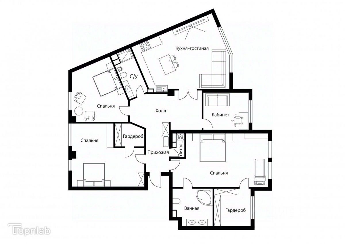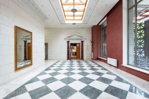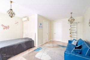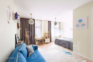 В квартире 3 спальни: одна из них мастер-блок 50 кв.м с приватной ванной комнатой и гардеробной с большим окном, вторая - просторная детская с личным гардеробом, гостевая комната, кабинет. Широкий коридор, где можно сделать библиотеку, зону отдыха, или каминную, постирочная, два санузла.
