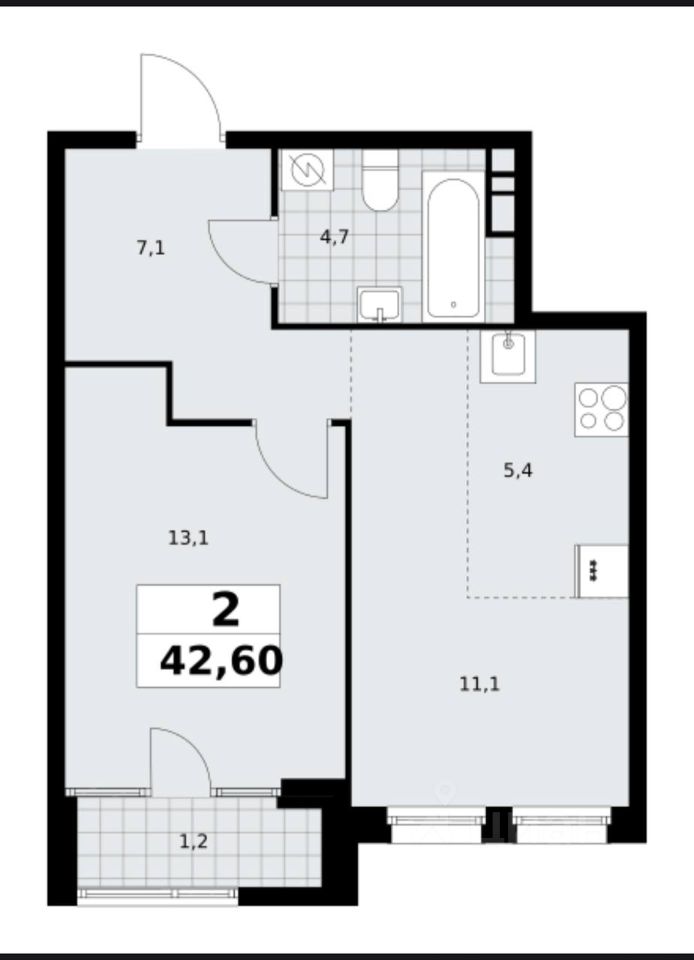 Общая площадь - 42,6 кв.м., спальня - 13,1 кв.м., кухня-гостинная - 11,1 + 5,4 кв.м., коридор - 7,1 кв.м., санузел - 4,7 кв.м., лоджия - 1.2 кв.м., потолки - 3,1 метра. Отделка White-box. Окна выходят на юго-запад.