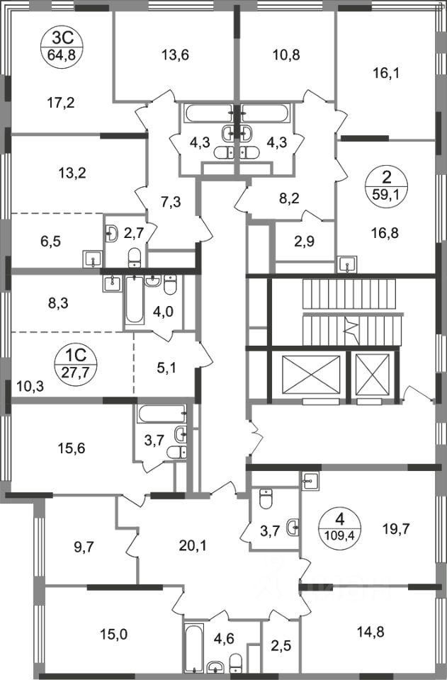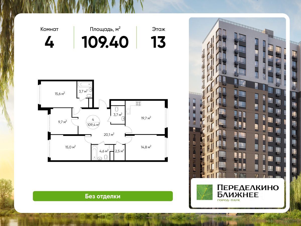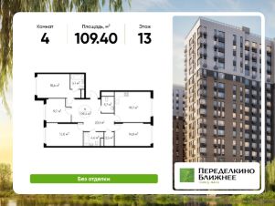 Общая площадь квартиры - 109,4 кв. м, этаж 13 из 17.