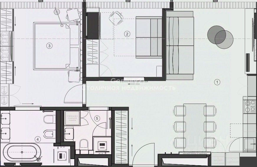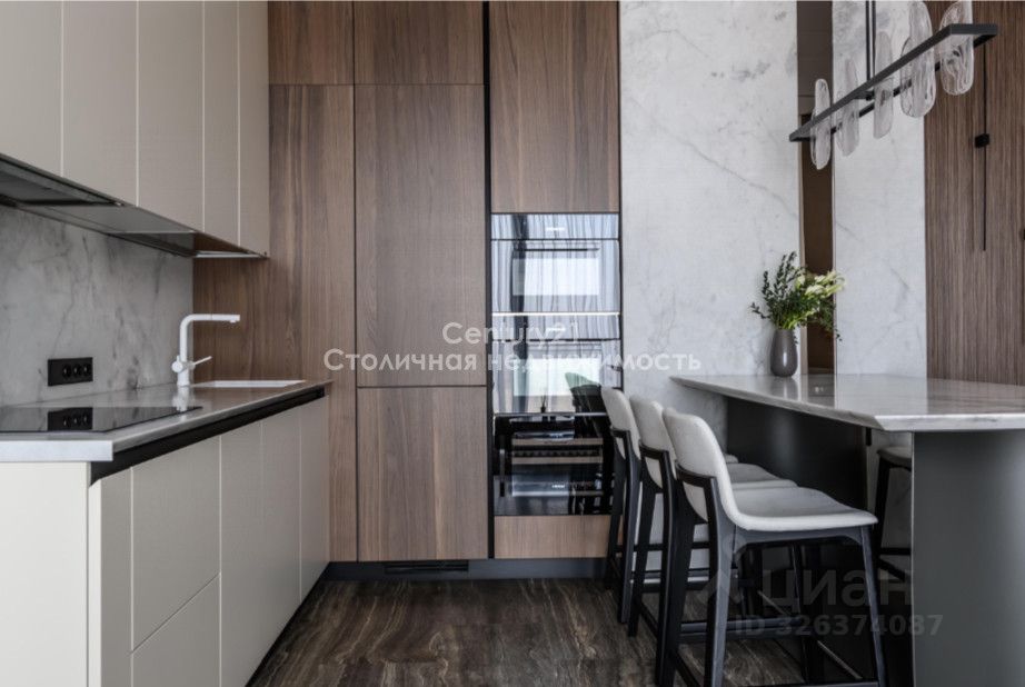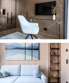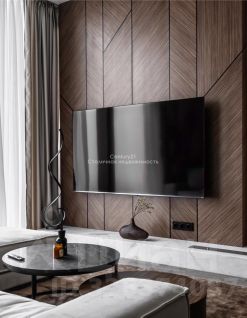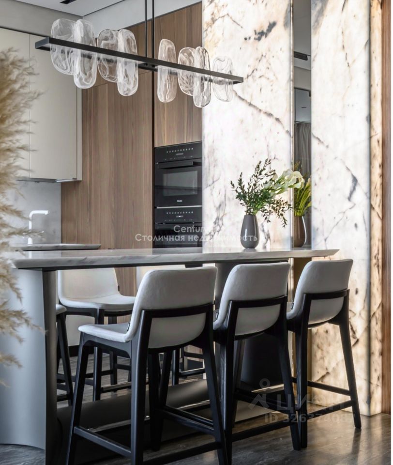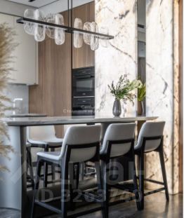 Интерьер оформлен в современном стиле в лаконичных светлых тонах. Установлены мебель из шпона LaStyle, итальянская кухня Scavolini, сантехника Salini. В апартаментах никто не жил. Спланирована кухня-гостиная с обеденной зоной, мастер-спальня со своей ванной комнатой, комната свободного назначения, которую можно использовать как кабинет или спальню, гостевой санузел, холл.