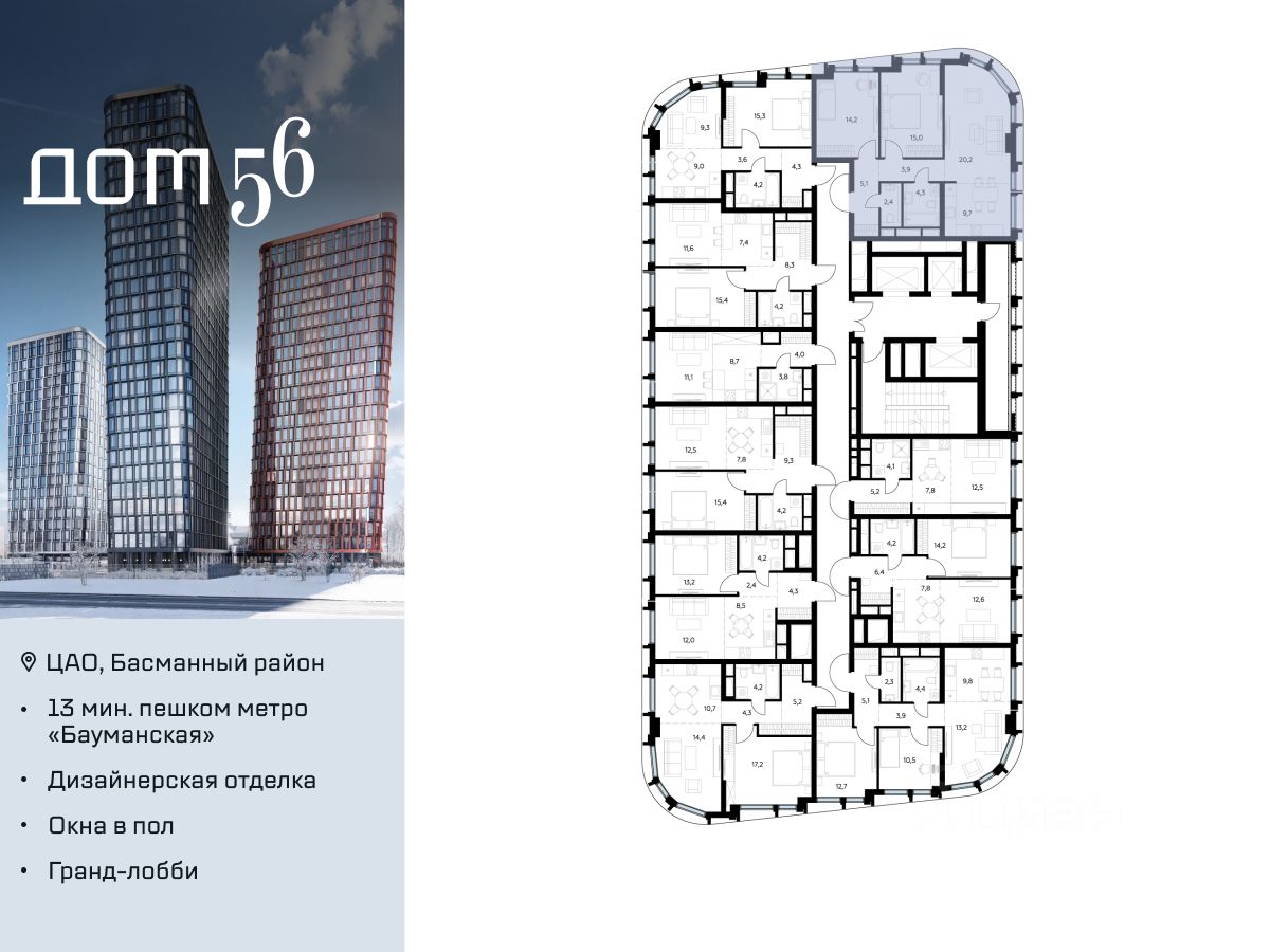 "Дом 56" - расположен в Басманном районе на ул. Фридриха Энгельса, всего в 12-15 минутах пешком от станций метро "Бауманская" и "Электрозаводская".