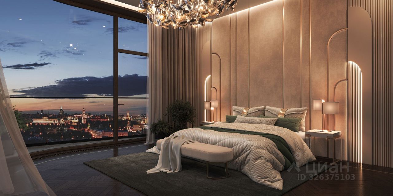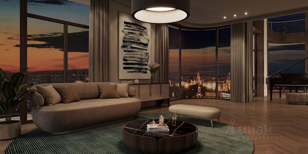 Единственная квартира в доме с отделкой и мебелью, её площадь 201,5 кв. м. Дизайн пространства разработало международное архитектурное бюро Олега Клодта. Продуманная планировка разделена на две зоны. В парадной части расположена кухня-гостиная площадью 85 кв. м, гостевой санузлел и прихожая, а в приватной - три спальни. Из панорамных окон просторной кухни-гостиной открываются впечатляющие прямые виды на Кремль, храм Христа Спасителя и Москва-Сити. Панорамные окна спален выходят в тихий приватный двор-парк с живописным ландшафтным дизайном, фонтаном и ручьём. В каждой спальне свой санузел и гардеробная.