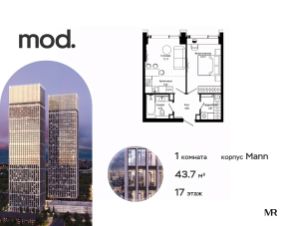 Продается 1-комнатная квартира общей площадью 43.80 м² с предчистовой отделкой в ЖК премиум-класса Mod на 17-м этаже 55 этажного дома.
