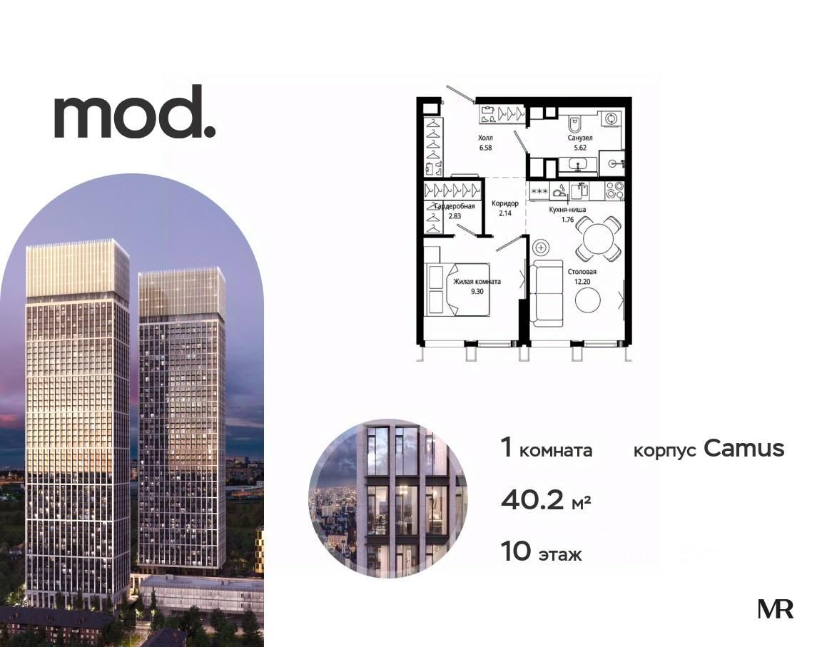 Продается 1-комнатная квартира общей площадью 40.20 м² с предчистовой отделкой в ЖК премиум-класса Mod на 10-м этаже 44 этажного дома.