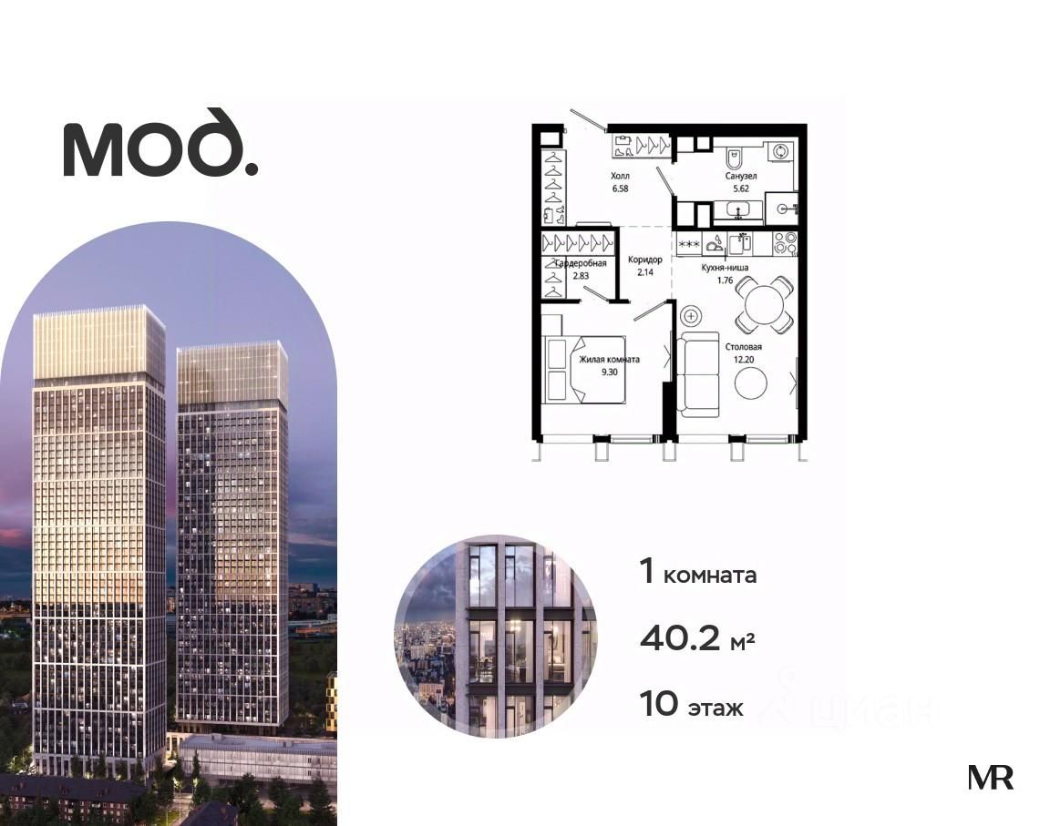 Продается 1-комнатная квартира общей площадью 40.20 м² с предчистовой отделкой в ЖК премиум-класса Мод на 10-м этаже 44 этажного дома.