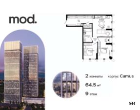 Продается 2-комнатная квартира общей площадью 64.50 м² с предчистовой отделкой в ЖК премиум-класса Mod на 9-м этаже 44 этажного дома.