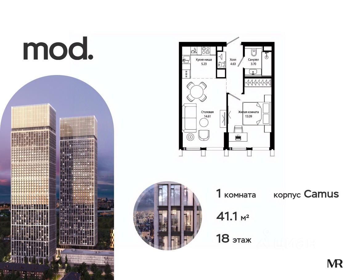 Продается 1-комнатная квартира общей площадью 41.10 м² с предчистовой отделкой в ЖК премиум-класса Mod на 18-м этаже 44 этажного дома.
